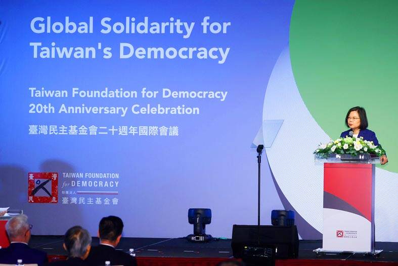 Taiwan would confront the destabilizing forces working against democracies while strengthening cooperation with democratic nations, President Tsai Ing-wen (蔡英文) said in Taipei yesterday at an event marking the 20th anniversary of the state-financed Taiwan Foundation for Democracy.