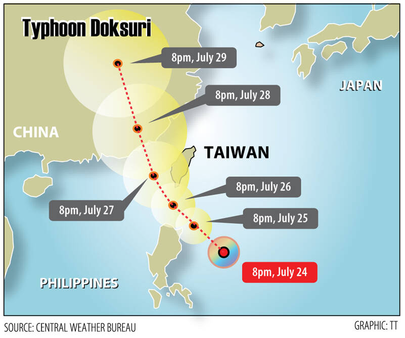 Doksuri is expected to affect Taiwan the most tomorrow and on Thursday, as it approaches the nation’s southwestern coastal areas and heads for China.
