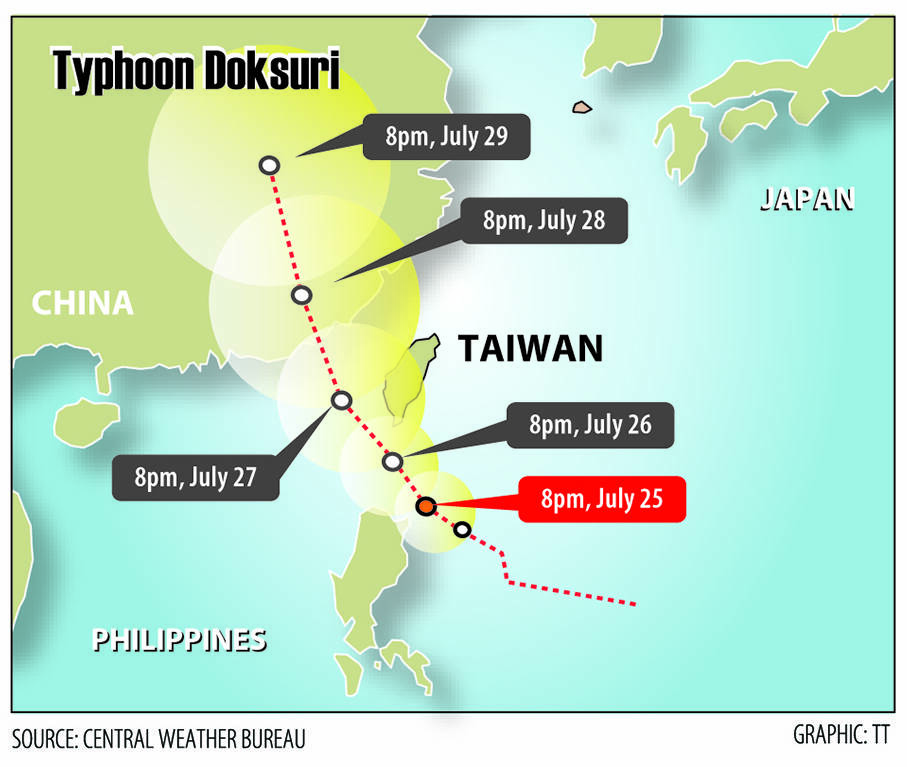 Doksuri is expected to enter the Bashi Channel today, move north along the southwest coast tomorrow before making landfall in China’s Fujian Province on Friday, Lo said.
