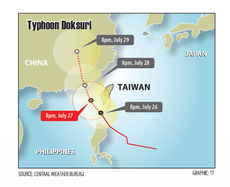 County and city governments yesterday announced closures of offices, schools and roads as Typhoon Doksuri approached Taiwan.