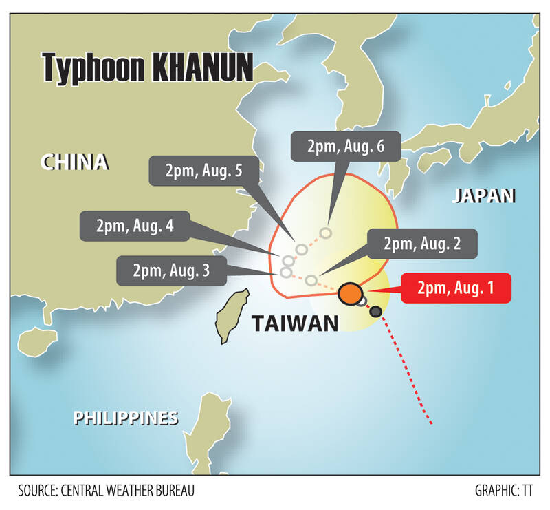 As of 8:30pm yesterday, Khanun was centered 650km east of Taipei and was moving northwest at 12kph, CWB data showed.