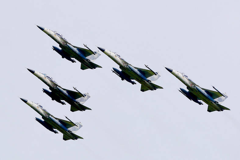 Taiwan’s domestically designed AIDC T-5 Brave Eagle trainer jets conducted a flyover in a formation of five, marking a first for that type of aircraft.