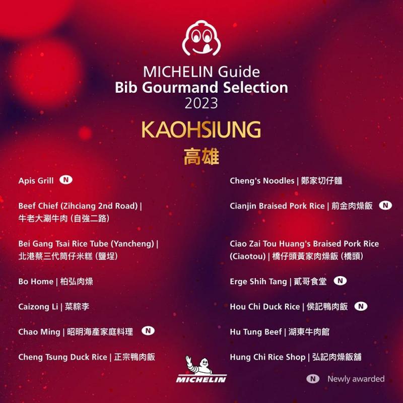The new eateries Kaohsiung are seafood restaurant Chao Ming; Erge Shih Tang, which serves Taiwanese cuisine; Ibu Kitchen, which serves Bunun food; Cianjin Braised Pork Rice; Hou Chi Duck Rice; Lao Ye Restaurant; Liao Chi Rice Cake; Mi Yuan Tzu Steamed Glutinous Rice; and Apis Grill.