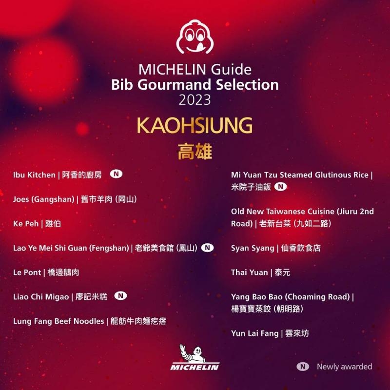 Of the 26 restaurants that made it to the Bib Gourmand for the first time this year, three are in Taipei, four are in Taichung, 10 are in Tainan and nine are in Kaohsiung.