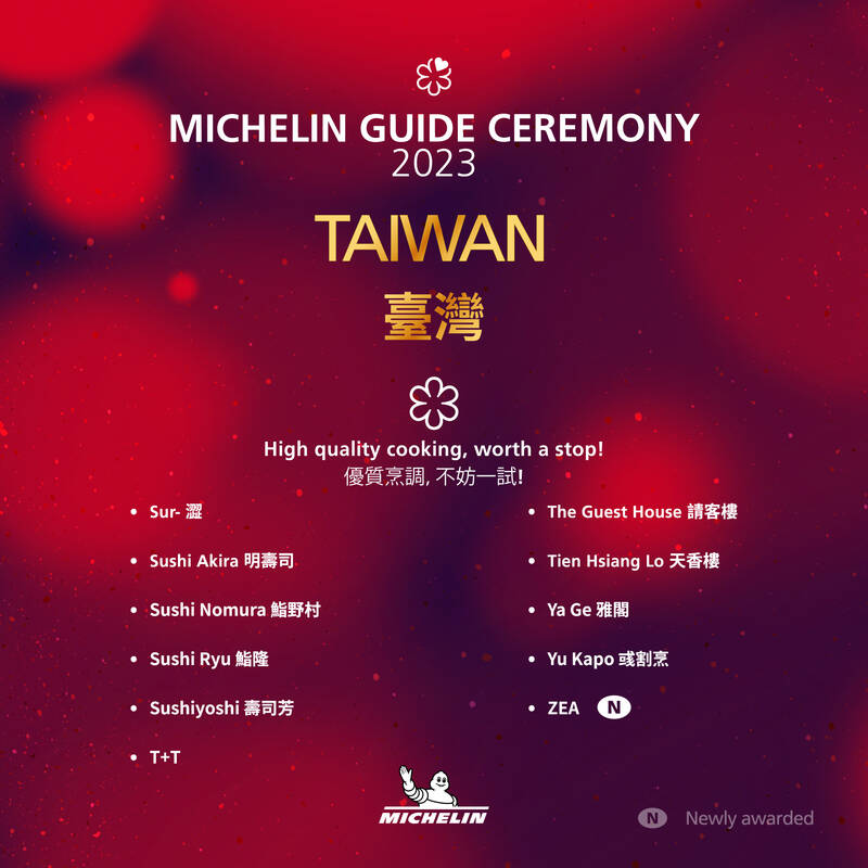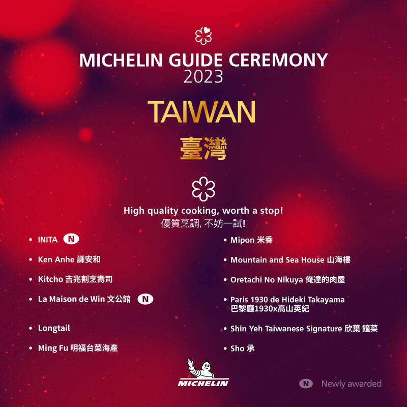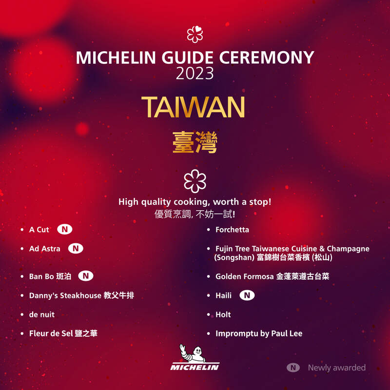 Of the 35 one-star restaurants, seven were first-timers: A cut, Ad Astra, Ban Bo (斑泊), Inita and Zea in Taipei, La Maison de Win (文公館) in Taichung and Haili in Kaohsiung.