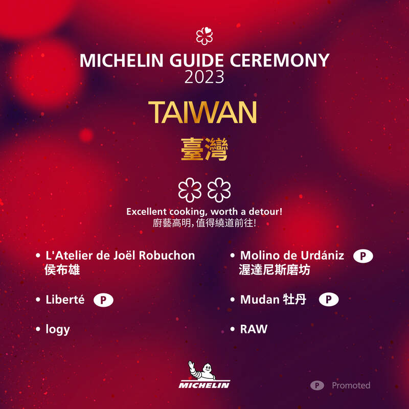 Three new two-star restaurants were one-star ones last year: Molino de Urdaniz (握達尼斯磨坊) and Mudan (牡丹) in Taipei and Liberte in Kaohsiung.