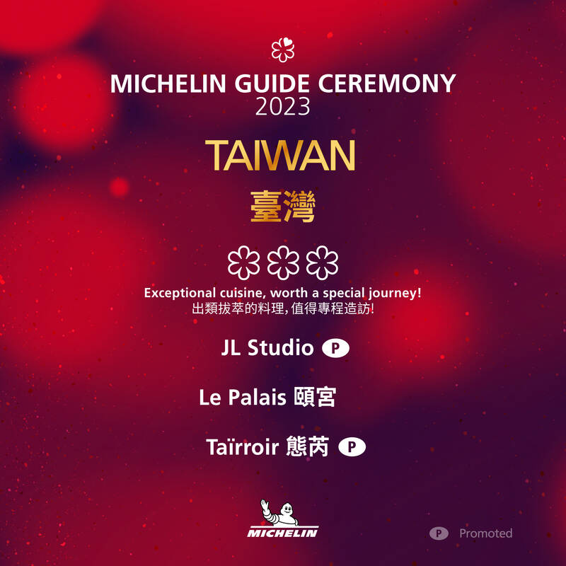 Taiwan now has three Michelin three-star restaurants, after JL Studio in Taichung and Tairroir (泰芮) in Taipei were promoted from the list of two-star restaurants last year, Michelin Guide announced yesterday.