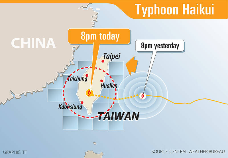 As of 9pm, the center of Haikui was 350km east-northeast of Oluanpi (鵝鑾鼻), Taiwan’s southernmost point, and moving west at 17kph, the bureau said, adding that it was packing maximum sustained winds of 144kph and gusts of up to 180kph.