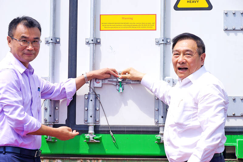 Minister of Agriculture Chen Chi-chung (陳吉仲) and Chan I Shan Foods chairman Chen Kuo-hsun (陳國訓) yesterday attended a ceremony in Pingtung County to seal the 40-foot shipping container that was filled with 22 tonnes of fresh pork for export to the Philippines.