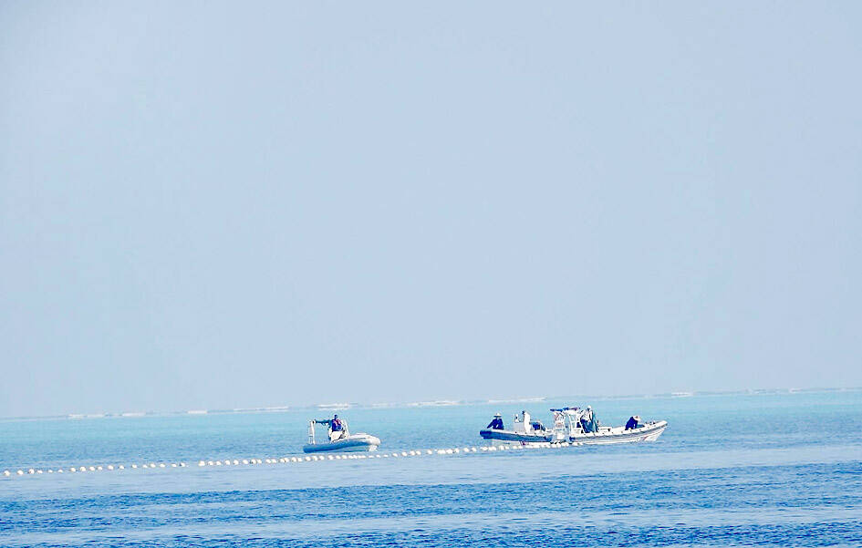 The Philippine Coast Guard yesterday said that it had cut a rope tethering the buoys to an anchor on the seabed, and hauled away the anchor, which allowed the line to drift.