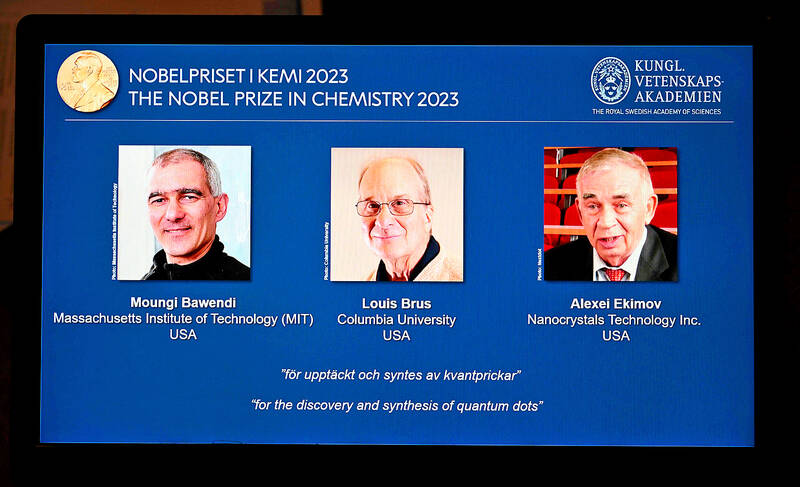 Three scientists won the Nobel Prize in chemistry on Wednesday for their work on quantum dots — tiny particles that can release very bright colored light and are used in electronics and medical imaging.