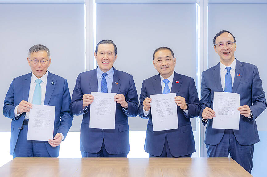 The parties met behind closed doors at the Ma Ying-jeou Foundation in Taipei, with former president Ma Ying-jeou (馬英九) serving as a witness.