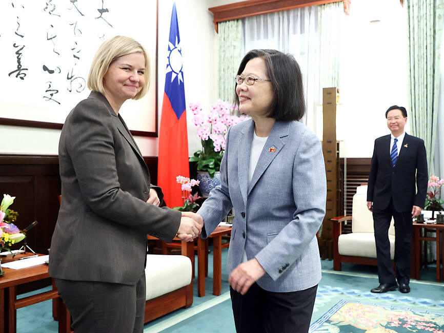 Liberal Party of Norway Chairwoman Guri Melby yesterday told President Tsai Ing-wen (蔡英文) that she would back the establishment of a representative office in Taipei, as supporting Taiwan is an important and critical mission of the free world.