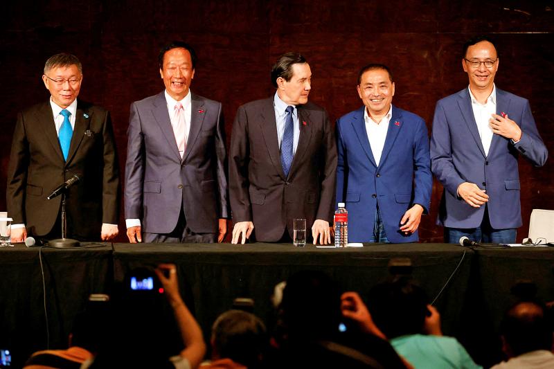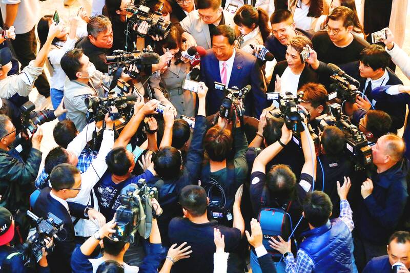 Gou was the first to arrive in the venue, followed by Hou at 4:46pm, who was accompanied by KMT Chairman Eric Chu (朱立倫) and former president Ma Ying-jeou (馬英九), also of the KMT.