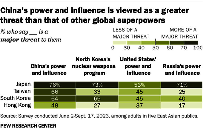 Japanese respondents showed the most concern over China, with 76 percent calling it a “major threat” compared with 66 percent in Taiwan and 64 percent in South Korea, it said.