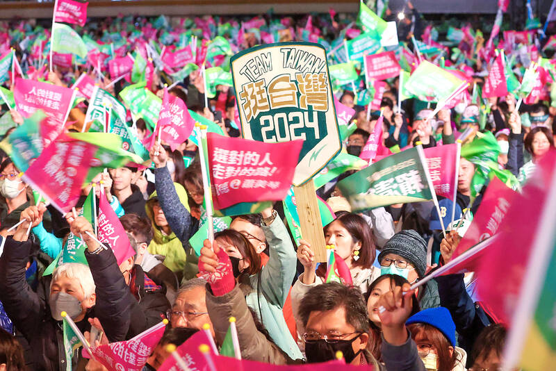 Democratic Progressive Party (DPP) heavyweights headed motorcades during the day before two major election-eve rallies, one in the north and one in the south, to boost support for its ticket of Vice President William Lai (賴清德) and his running mate, former representative to the US Hsiao Bi-khim (蕭美琴).