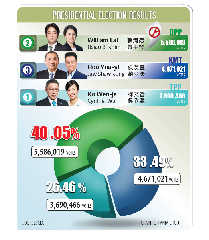DPP presidential candidate William Lai (賴清德) received 5,586,019 votes, or 40.05 percent of the total, while Chinese Nationalist Party (KMT) candidate and New Taipei City Mayor Hou You-yi (侯友宜) won 4,671,021 votes, or 33.49 percent of the total, Central Election Commission figures showed.