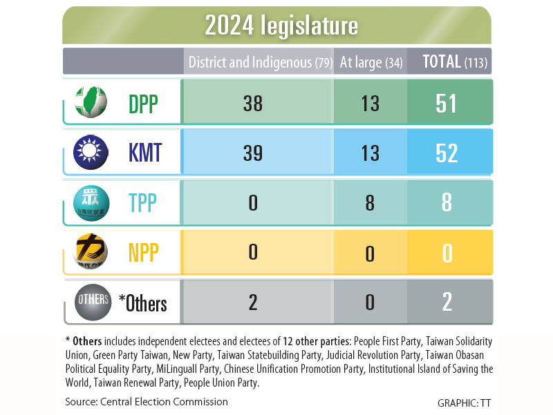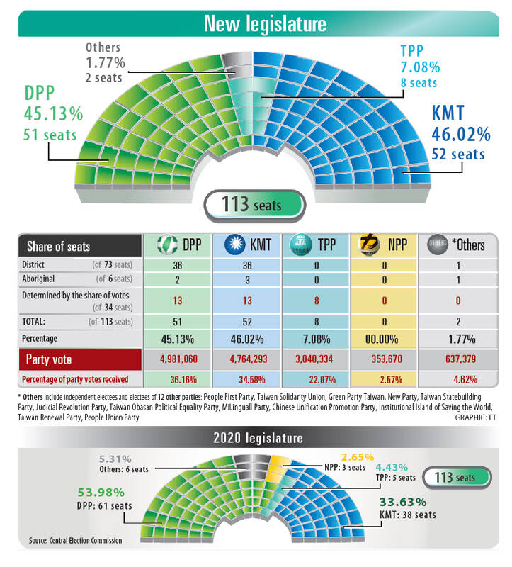 No party won a majority of legislative seats in yesterday’s elections, with the Democratic Progressive Party (DPP) taking 51 seats and the Chinese Nationalist Party (KMT) taking 52 seats.
