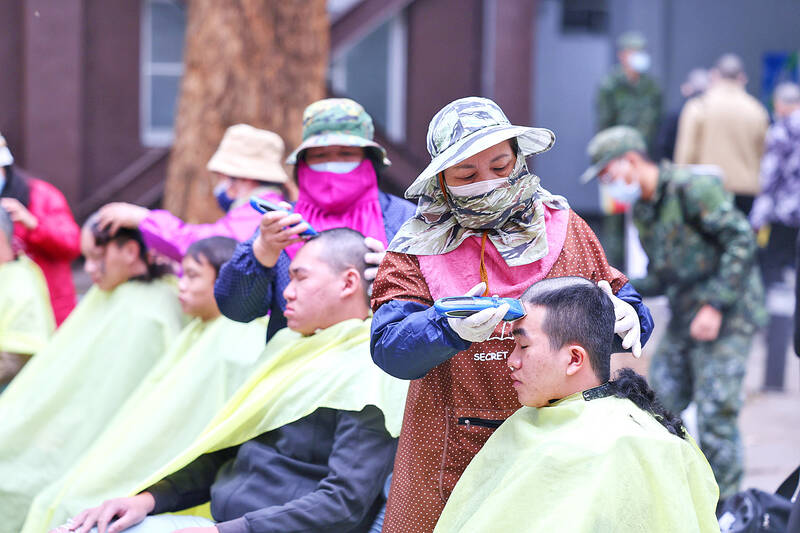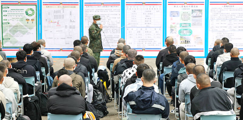 At the Chenggong Ling (成功嶺) military training camp in Taichung, a group of young men gathered in the morning cold to be inducted, as dogs checked their bags for drugs and barbers shaved their heads before changing into army fatigues.