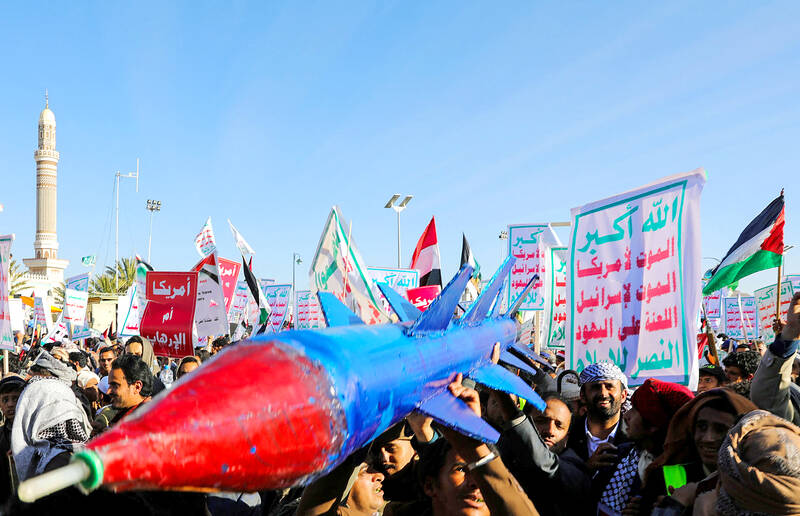 US forces struck an anti-ship missile in Yemen that they said was ready to fire early yesterday, hours after the Iran-backed rebels caused a fire on a British tanker in the Gulf of Aden with a similar munition, as intense fighting raged in the Gaza Strip’s Khan Yunis.