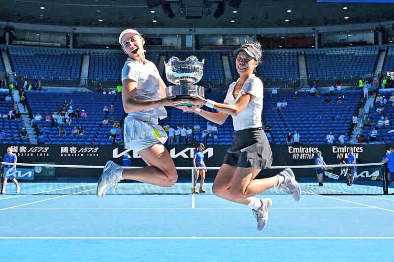 Tennis ace Hsieh Su-wei (謝淑薇) yesterday became the first Taiwanese to win two titles at the same Grand Slam event, after she and Belgian partner Elise Mertens won the women’s doubles title at the Australian Open.