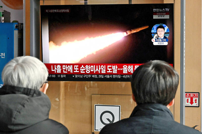 The South Korean military yesterday said that North Korea fired several cruise missiles that flew over waters near a major military shipyard on the country’s eastern coast, extending a streak in weapons tests that are worsening tensions with the US, South Korea and Japan.