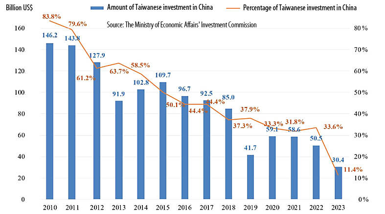 The amount and proportion of Taiwanese investments in China has been declining, with 328 investments last year totaling US$3.04 billion, a decrease of 39.8 percent from the same period a year earlier, the data showed.