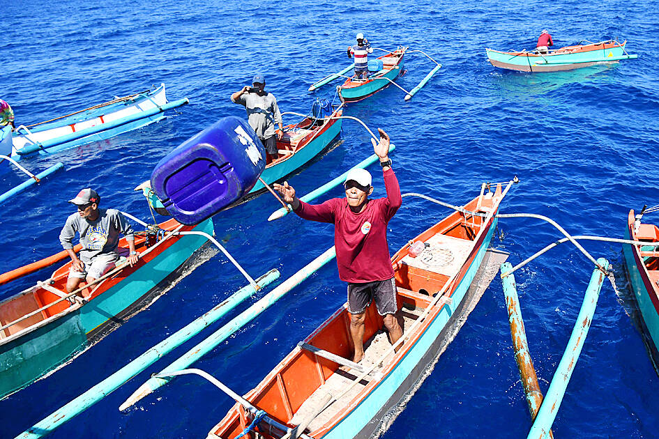Fishers in small wooden outriggers bobbed around in the water as they waited to receive blue plastic jerry cans of diesel and food parcels from the Datu Tamblot crew.