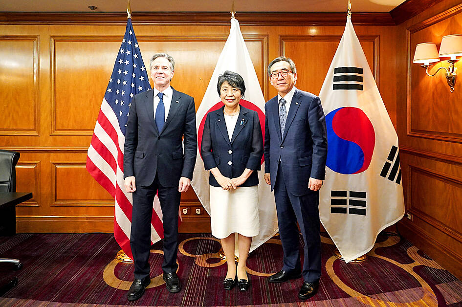 US Secretary of State Antony Blinken, Japanese Minister of Foreign Affairs Yoko Kamikawa and South Korean Minister of Foreign Affairs Cho Tae-yul “discussed efforts to maintain peace and stability across the Taiwan Strait” on the sidelines of the G20 Foreign Ministers Meeting in Rio de Janeiro, Brazil, on Thursday, US Department of State spokesman Mathew Miller said.