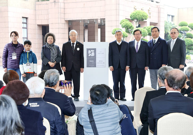 Premier Chen Chien-jen (陳建仁) yesterday unveiled a monument at the Executive Yuan in Taipei, officially designating it a “historical site of injustice” to commemorate the victims killed during the 228 Incident of 1947.