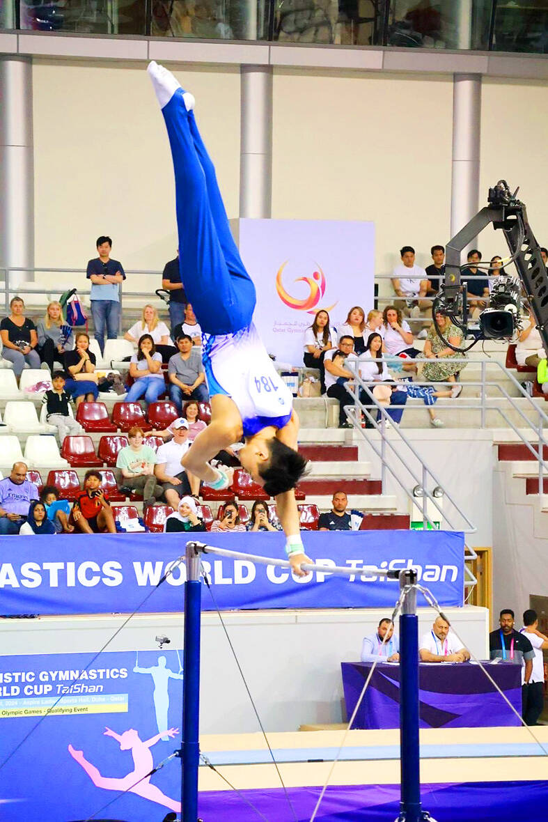 Taiwanese gymnast Tang Chia-hung (唐嘉鴻) on Saturday won a gold medal in the men’s horizontal bar competition at the Doha World Cup, extending a run of dominant performances in the lead-up to the Paris Summer Olympics.