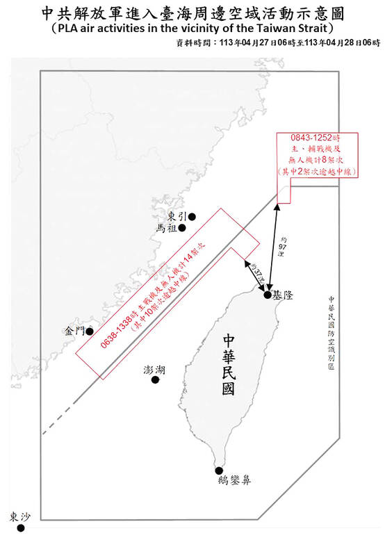 Twelve of the 22 aircraft crossed the median line of the Taiwan Strait and entered Taiwan’s northern air defense identification zone, including an unspecified number that flew as close as 37 nautical miles (68.5km) to Keelung, the ministry said.