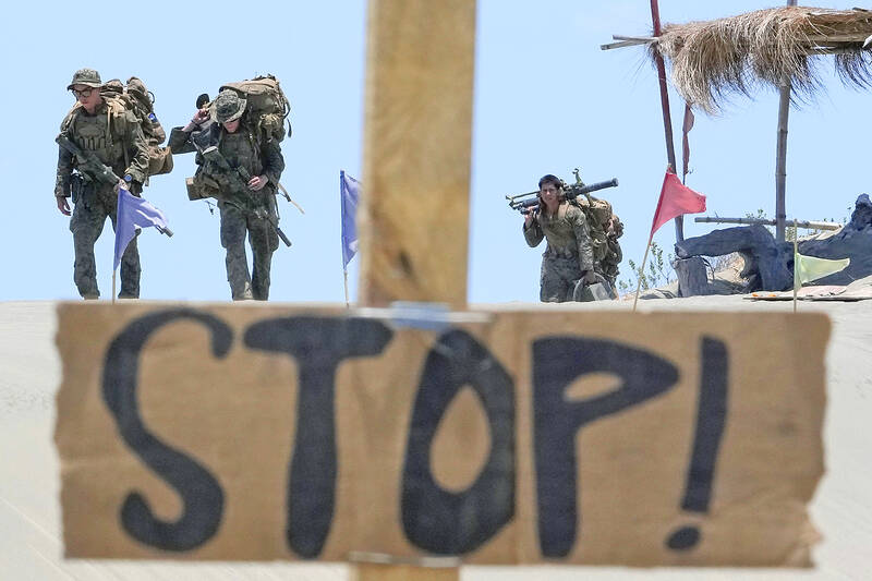 Journalists watched yesterday’s event on video screens beamed toward a strip of sand dunes where, two days earlier, the two allies had also conducted a live-fire exercise with missiles and artillery to stop an imaginary invasion force landing on the Philippines’ north coast.