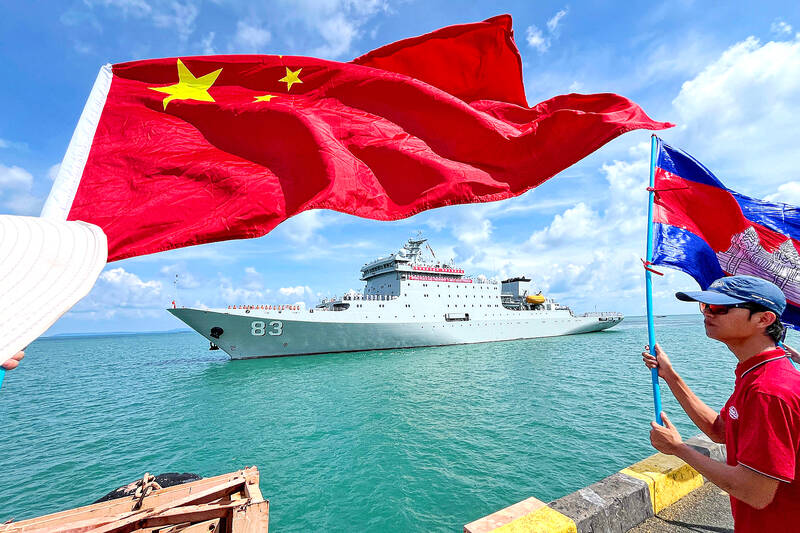 Two Chinese warships yesterday docked in a commercial port in Cambodia as part of the biggest-ever joint military drills with the Southeast Asian nation, with Beijing’s ambassador hailing their “ironclad” friendship.