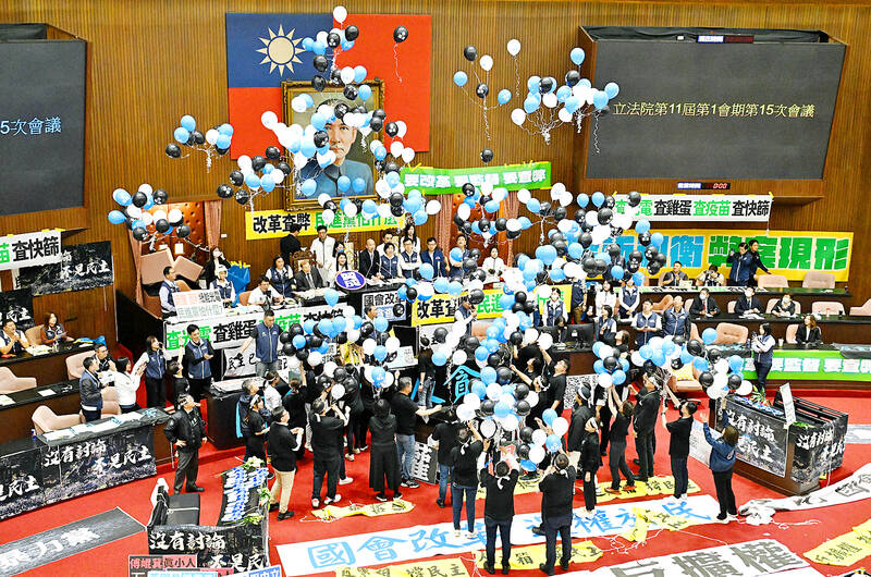 Later in the evening, DPP lawmakers released blue, white and black balloons to represent the Legislative Yuan being haunted by “the specter of of KMT, TPP and black box procedures.”