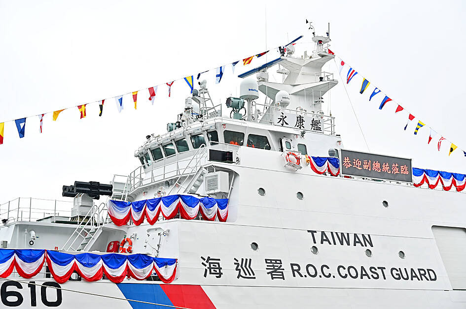 The latest domestically designed and built 600-tonne class Coast Guard Administration (CGA) vessel, the Yong Kang (永康艦), was yesterday formally launched by Vice President Hsiao Bi-khim (蕭美琴) in Kaohsiung as part of efforts to beef up the nation’s coastal patrol capabilities amid rising tensions with China.