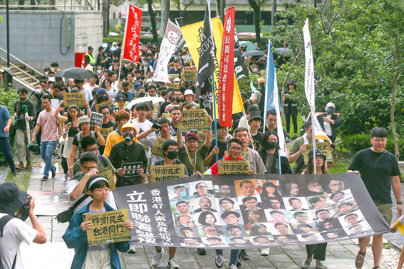 Hundreds of people rallied in downtown Taipei yesterday, calling on people to unite to safeguard democracy and freedom, while condemning China’s crackdown on Hong Kong and marking the fifth anniversary of the start of the territory’s mass democracy protests in 2019.