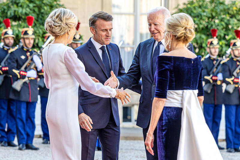 Reporters heard Biden tell Macron about his last discussion with Chinese President Xi Jinping (習近平), who Biden said had objected to US tariffs on Chinese electric vehicles.