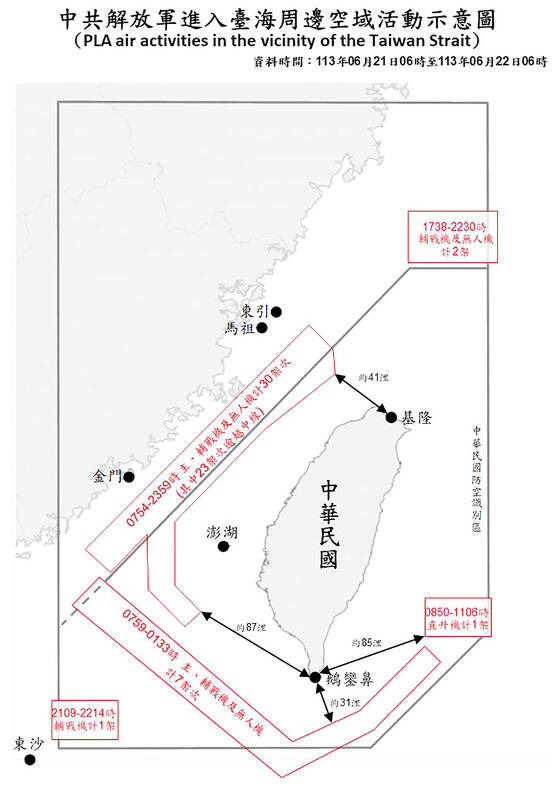 Of the nine aircraft that crossed the median line’s extension, were seven fighter jets and two drones that flew around the southwestern ADIZ and entered airspace off the country’s east coast, some flying as close as 31 nautical miles (57.4km) from Oluanpi (鵝鑾鼻), Taiwan’s southernmost tip, ministry data showed.