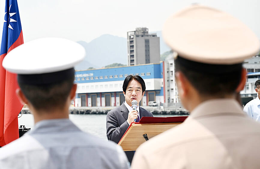 Lai yesterday inspected the Weihai Naval Base (威海營區) at the Port of Keelung, home to the nation’s 131st Fleet and its indigenously built Tuo Jiang-class corvettes.