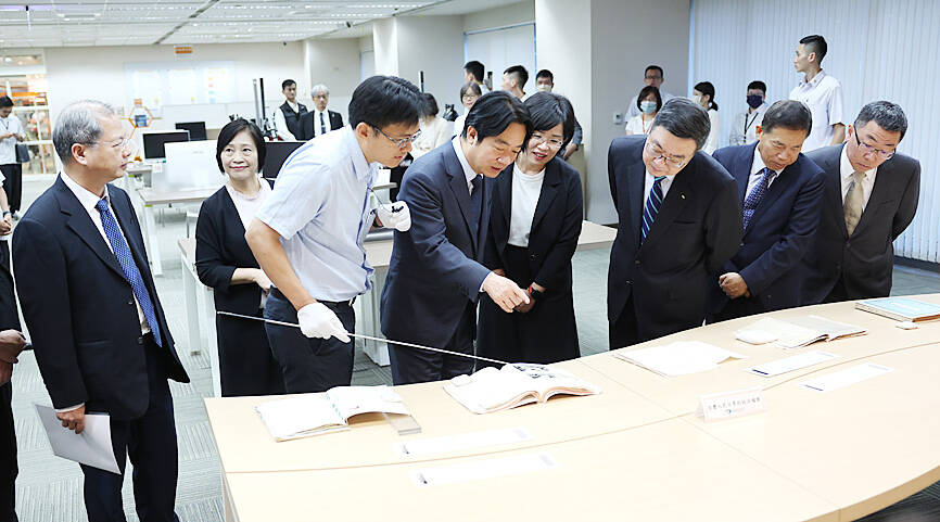 Lai and Premier Cho Jung-tai (卓榮泰) visited the National Archives Administration and its reading center to review declassified records from the 228 Incident and the Martial Law era, including documents promulgated by the then-government under the National Security Act During the Period of National Mobilization for Suppression of the Communist Rebellion.
