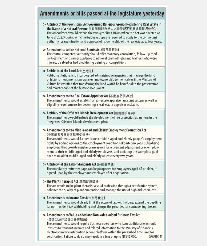 Amendments to the Labor Standards Act (勞動基準法), the Middle-aged and Elderly Employment Promotion Act (中高齡者及高齡者就業促進法), the Land Act (土地法) and the National Sports Act (國家體育法), and a draft bill of the plant therapist act (植物診療師法) all passed their third readings at the legislature.