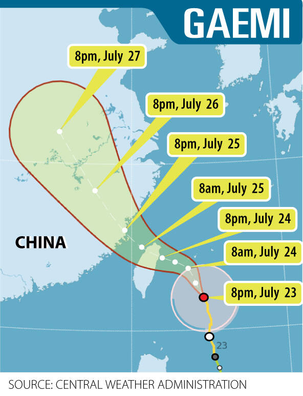 As Gaemi’s circumference extends to the waters in the Bashi Channel and off Taiwan’s east coast, the storm poses a threat to residents in Yilan, Hualien, Taitung and Nantou counties, as well as Kaohsiung and cities and counties north of Chiayi, the agency said, adding that the storm would gain strength as it expands.