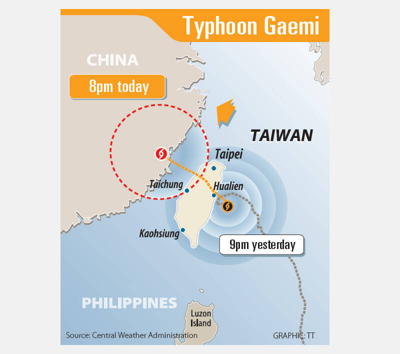 Taiwan would face severe challenges over the next 24 hours, as Gaemi would bring strong winds and torrential rainfall, Premier Cho Jung-tai (卓榮泰) said in a meeting at the center as he and President William Lai (賴清德) listened to briefings from government officials.