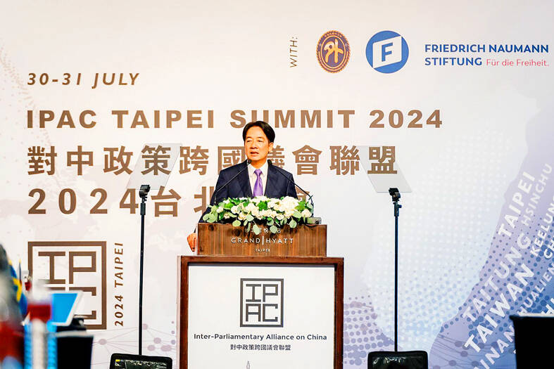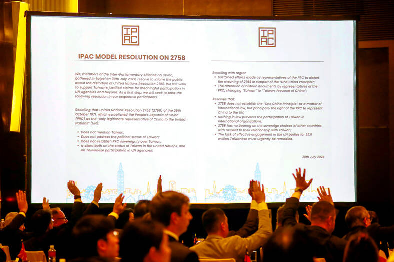 China has falsely linked UN General Assembly Resolution 2758 with its “one China principle” and used the resolution to legitimize its acts to limit Taiwan’s participation in world bodies and possibly invade Taiwan by force, President William Lai (賴清德) said at the annual meeting of the Inter-Parliamentary Alliance on China (IPAC) in Taipei yesterday.