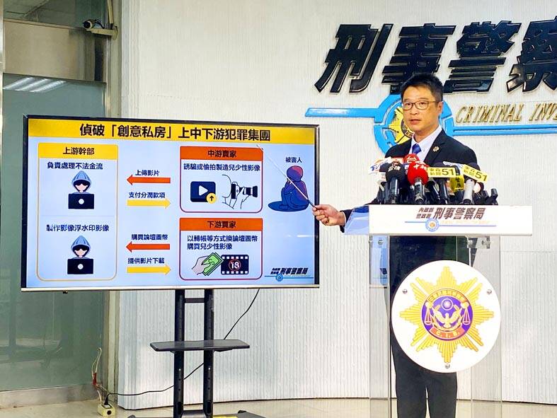 It took a lot of coordination and resources over the past two months for law enforcement authorities to investigate the two forums, Chuangyi Sifang (創意私房) and SCP, operating on the encrypted messaging platform Telegram, CIB High-tech Crime Center chief Lin Chien-lung (林建隆) told a news conference in Taipei.