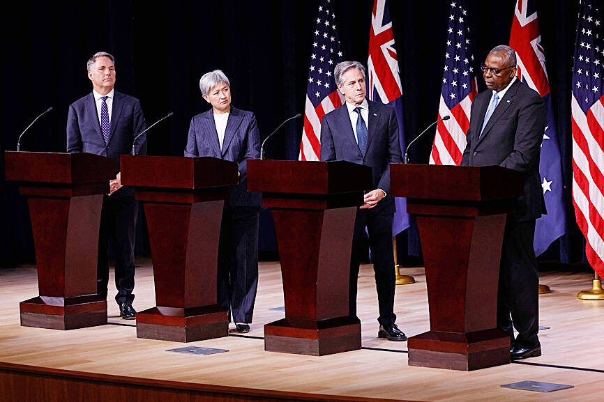 The statement followed a ministers’ summit in Annapolis, Maryland, on Tuesday attended by US Secretary of State Antony Blinken, US Secretary of Defense Lloyd Austin, Australian Minister for Foreign Affairs Penny Wong (黃英賢) and Australian Deputy Prime Minister and Minister for Defence Richard Marles.
