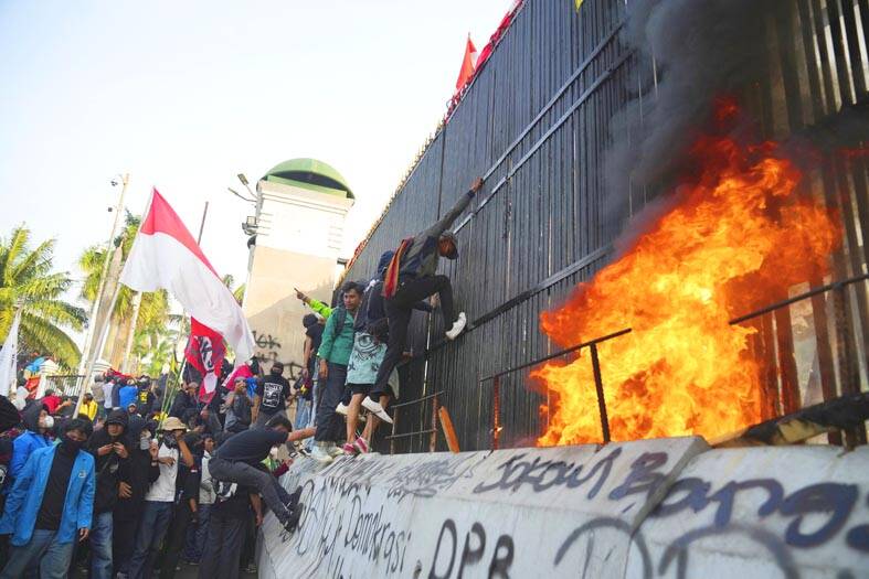 Thousands of people yesterday attempted to storm Indonesia’s parliament, tearing down a section of fence and throwing stones at police, and forcing the legislature to delay a vote on changes to election laws that could further enhance the political influence of Indonesian President Joko Widodo.