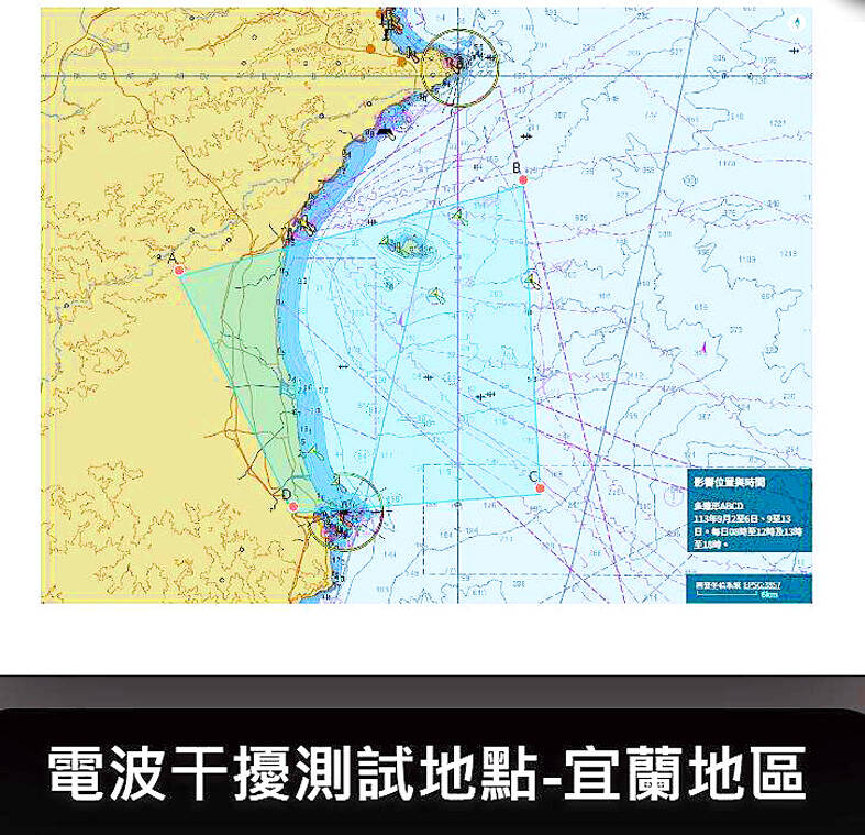 Two radio jamming tests encompassing the coastal region between Toucheng (頭城) and Suao (蘇澳) townships and the nearby sea would be conducted from Sept. 2 to 6 and from Sept. 9 to 13, a Ministry of Transportation and Communications notice said.