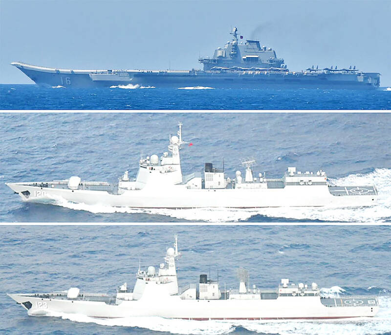 A Chinese naval formation led by the Liaoning aircraft carrier sailed through waters northeast of Taiwan yesterday and continued toward the southeast of Japan’s Yonaguni Island, the Ministry of National Defense said.